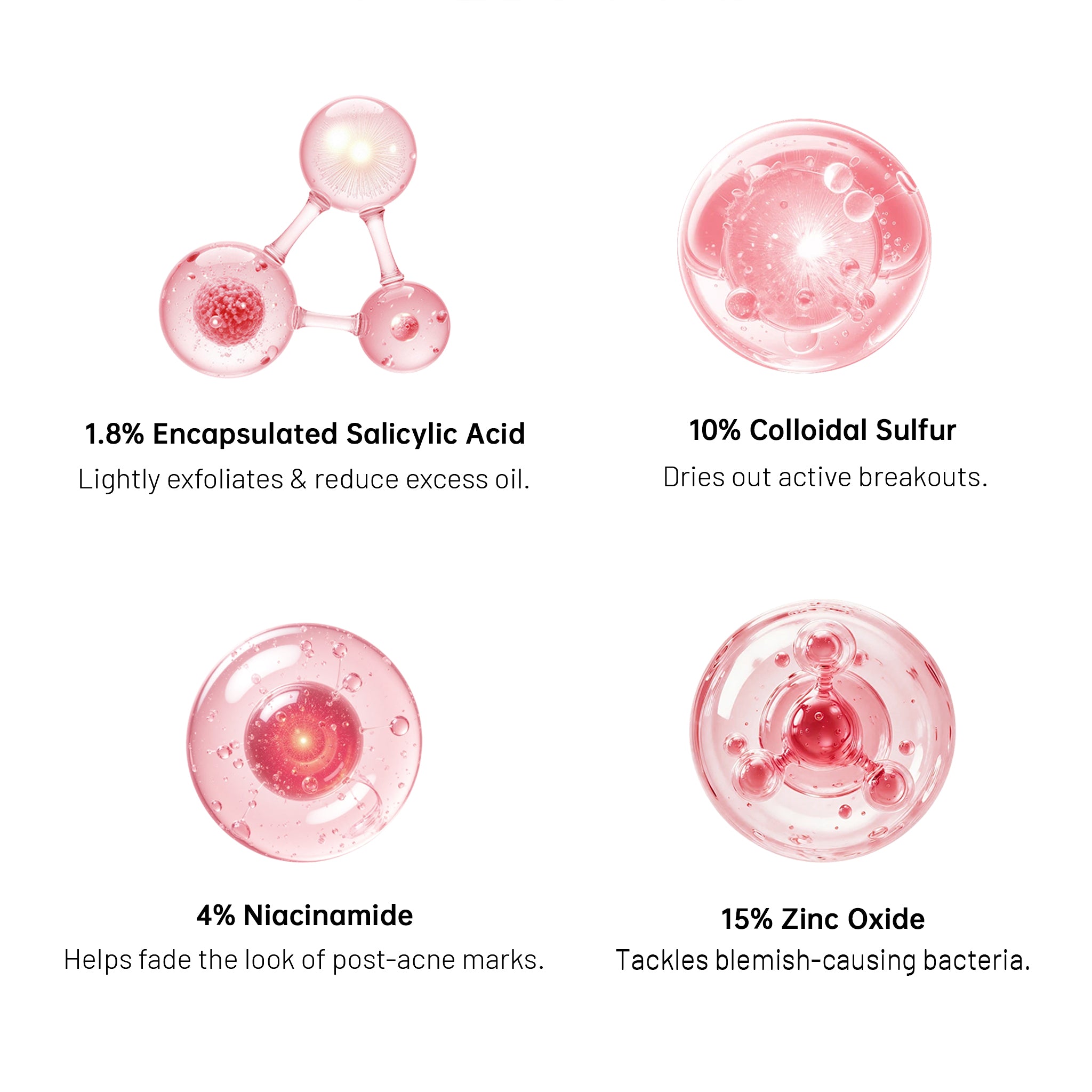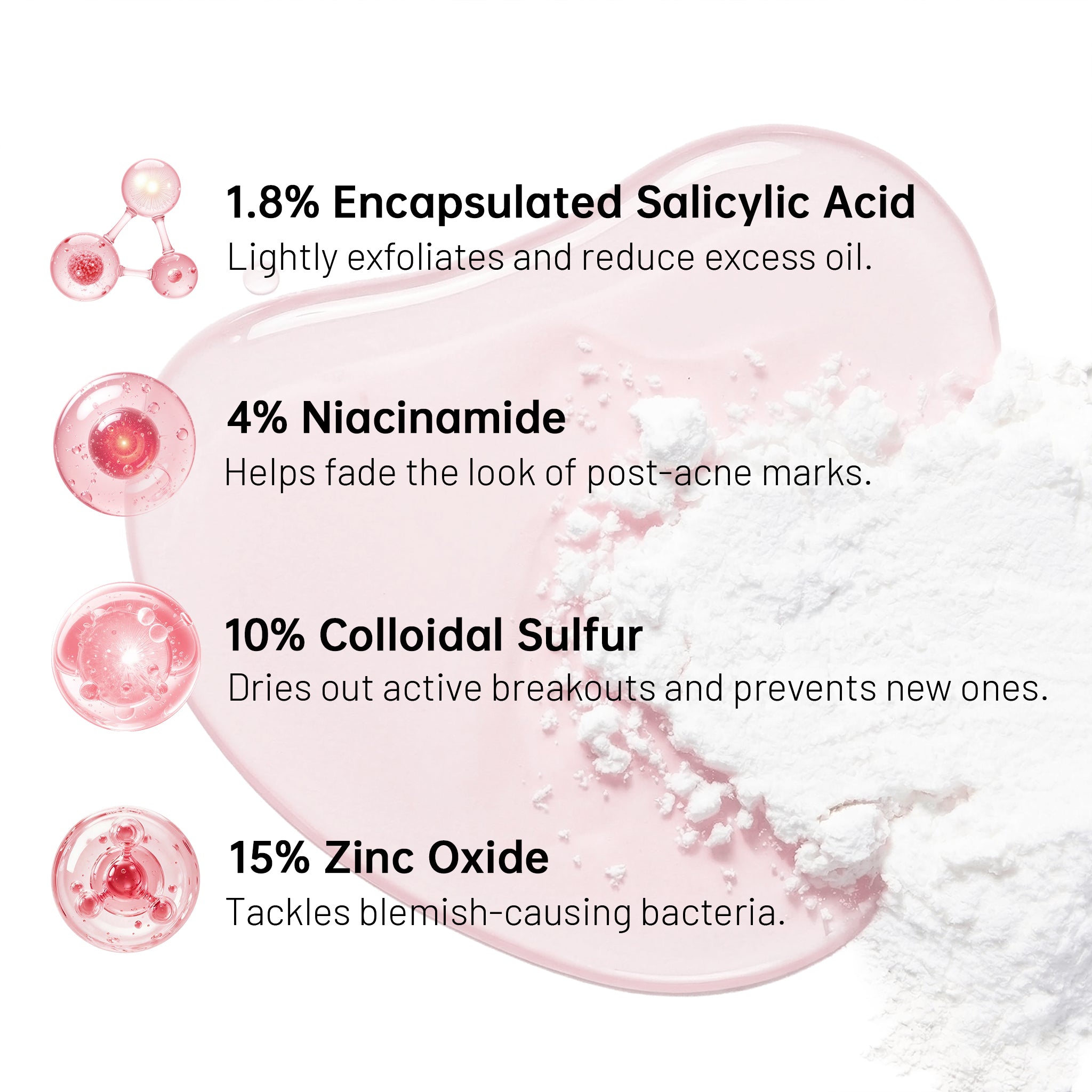 Ingredients: Alcohol, Aqua, Zinc Oxide, Colloidal Sulfur, Glycerin, Niacinamide, Calamine, Butylene Glycol, Salicylic Acid, Portulaca Oleracea Extract, Fomes Officinalis (Mushroom) Extract, Avena Sativa (Oat) Kernel Extract, Bifida Ferment Filtrate, Ectoin, Disodium Phosphate, Phenoxyethanol, Methyl Cyclodextrin, Pentylene Glycol, 1,2-Hexanediol, Acacia Senegal Gum, Maltodextrin.